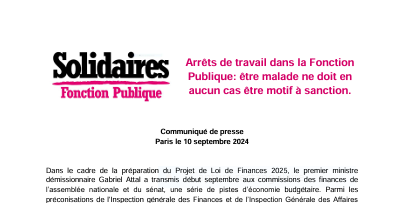 Dans le cadre de la préparation du Projet de Loi de Finances 2025, le premier ministre démissionnaire Gabriel Attal a transmis début septembre aux commissions des finances de l’assemblée nationale et du sénat, une série de pistes d’économie budgétaire. Parmi les préconisations de l'Inspection générale des Finances et de l’Inspection Générale des Affaires Sociales, il est envisagé, une fois de plus, de faire des économies aux dépens de la santé des agent·es de la fonction publique en s’attaquant aux dispositifs qui organisent leurs arrêts de travail.