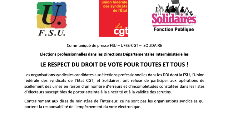 Les organisations syndicales candidates aux élections professionnelles dans les DDI dont la FSU, l’Union fédérale des syndicats de l’Etat CGT, et Solidaires, ont refusé de participer aux opérations de scellement des urnes en raison d’un nombre d’erreurs et d’incomplétudes constatées dans les listes d’électeurs susceptibles de porter atteinte à la sincérité et à la validité des scrutins.