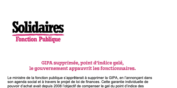 Le ministre de la fonction publique s’apprêterait à supprimer la GIPA, en l’annonçant dans son agenda social et à travers le projet de loi de finances. Cette garantie individuelle de pouvoir d’achat avait depuis 2008 l’objectif de compenser le gel du point d’indice des fonctionnaires. Elle était réservée aux agent·es dont l’évolution du traitement indiciaire brut sur les 4 dernières années était inférieure à l’évolution de l’indice des prix à la consommation.