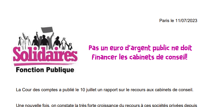 Pour Solidaires FP cette situation, dénoncée régulièrement, est inadmissible et c’est bien le principe même de recours aux cabinets de conseils par les ministères que nous rejetons.