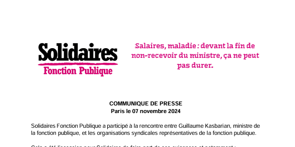 Solidaires Fonction Publique a participé à la rencontre entre Guillaume Kasbarian, ministre de la fonction publique, et les organisations syndicales représentatives de la fonction publique.