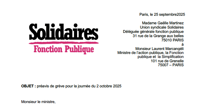 L’Union syndicale Solidaires Fonction publique dépose un préavis de grève pour la journée du 2 octobre (de 0 h à 24 h).