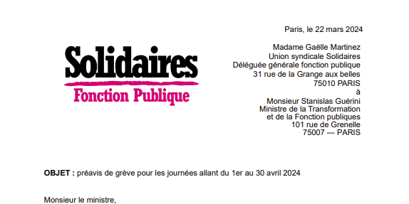 L’Union syndicale Solidaires Fonction publique dépose un préavis de grève pour les journées allant du 1er au 30 avril 2024 (de 0 h à 24 h).