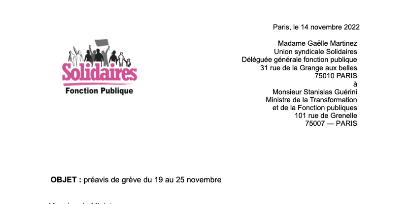 L’Union syndicale Solidaires Fonction Publique dépose un préavis de grève du 19 au 25 novembre à 00h01 (ce préavis comprend la nuitée en amont de cette journée pour les personnels travaillant en horaires décalés) jusqu’au 25 novembre 24h.