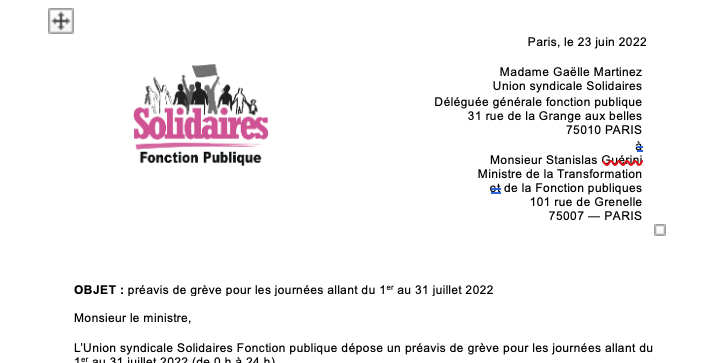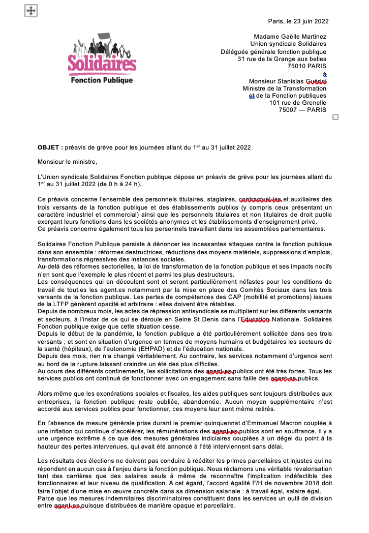 L’Union syndicale Solidaires Fonction publique dépose un préavis de grève pour les journées allant du 1er au 31 juillet 2022 (de 0 h à 24 h).