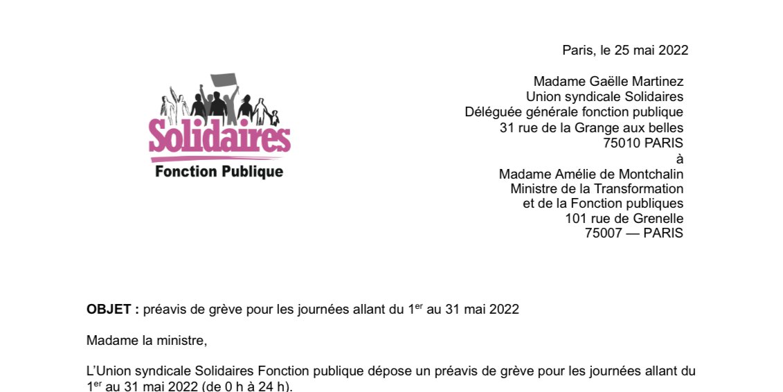 L’Union syndicale Solidaires Fonction publique dépose un préavis de grève pour les journées allant du 1er au 31 mai 2022 (de 0 h à 24 h).