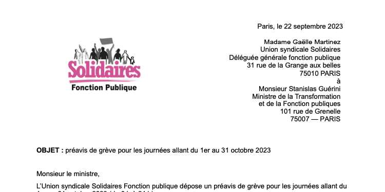 L’Union syndicale Solidaires Fonction publique dépose un préavis de grève pour les journées allant du 1er au 31 octobre 2023 (de 0 h à 24 h).