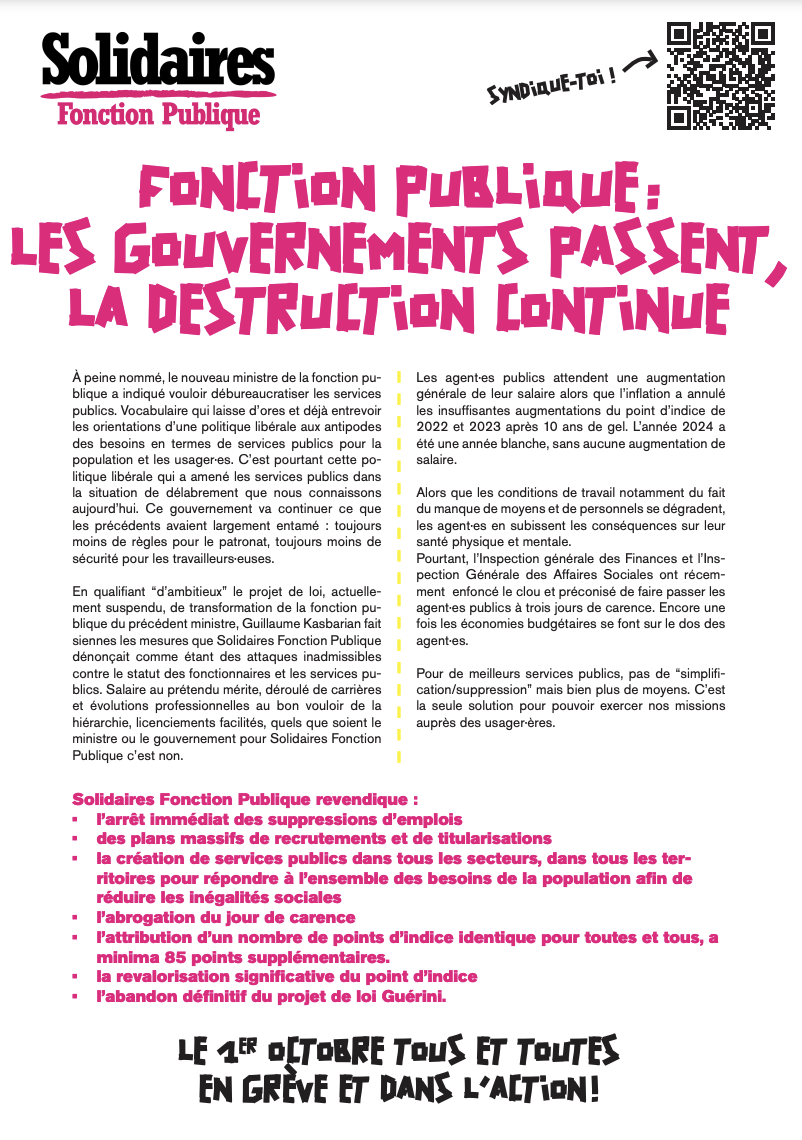 En qualifiant “d’ambitieux” le projet de loi, actuellement suspendu, de transformation de la fonction publique du précédent ministre, Guillaume Kasbarian fait siennes les mesures que Solidaires Fonction Publique dénonçait comme étant des attaques inadmissibles contre le statut des fonctionnaires et les services publics. Salaire au prétendu mérite, déroulé de carrières et évolutions professionnelles au bon vouloir de la hiérarchie, licenciements facilités, quels que soient le ministre ou le gouvernement pour Solidaires Fonction Publique c’est non.