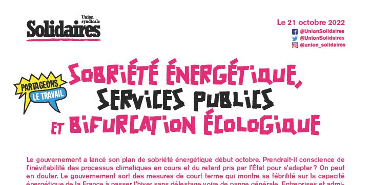 Pour Solidaires, c’est à la bifurcation écologique et sociale qu’il faut s’atteler. Cela passe par une refonte de la fiscalité qui réponde aux enjeux écologiques et sociaux, et des politiques publiques qui s'appuient sur des services publics au plus près des usagers.