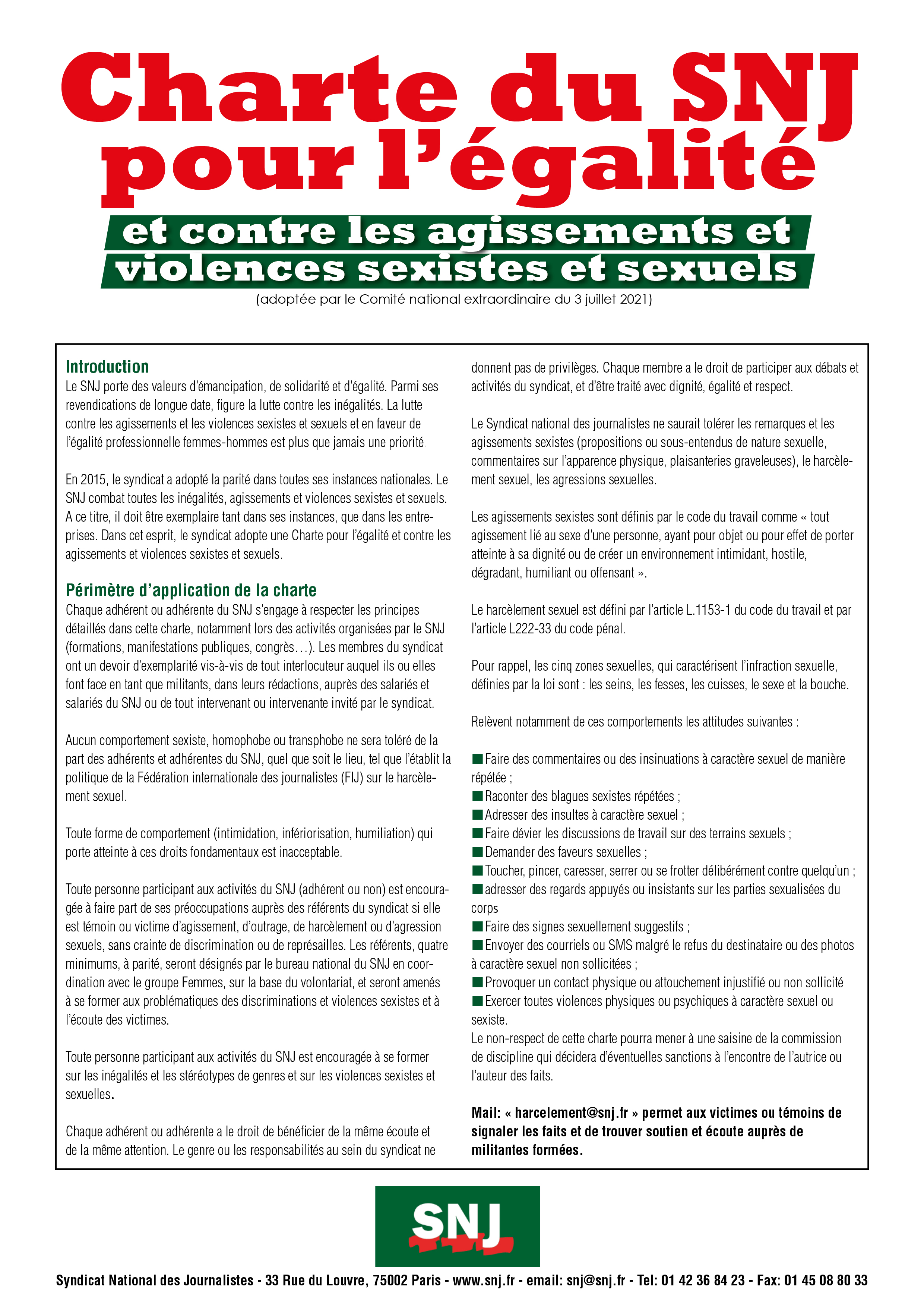 Cette formation vient compléter la démarche engagée par le SNJ en juillet 2021, avec l'adoption d'une charte contre les comportements sexistes et les violences sexuelles et d'un dispositif interne de traitement des signalements de violences.