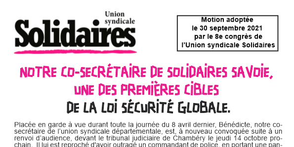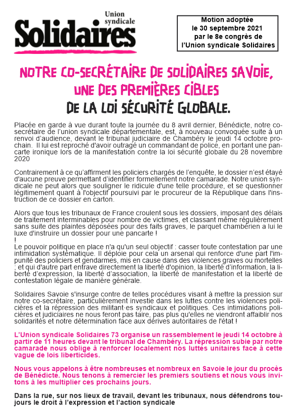 Placée en garde à vue durant toute la journée du 8 avril dernier, Bénédicte, notre co-secrétaire de l’union syndicale départementale, est, à nouveau convoquée suite à un renvoi d’audience, devant le tribunal judiciaire de Chambéry le jeudi 14 octobre prochain. Il lui est reproché d'avoir outragé un commandant de police, en portant une pancarte ironique lors de la manifestation contre la loi sécurité globale du 28 novembre 2020