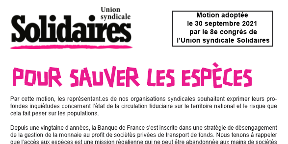 Par cette motion, les représentant.es de nos organisations syndicales souhaitent exprimer leurs profondes inquiétudes concernant l’état de la circulation fiduciaire sur le territoire national et le risque que cela fait peser sur les populations.