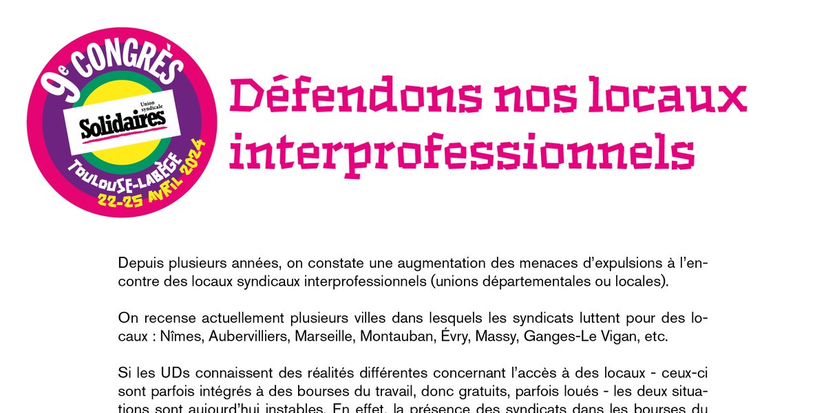 Alors que les droits syndicaux sont attaqués de toute part, il est plus que nécessaire que Solidaires s’engage dans la lutte pour la création de lieux pérennes pour les syndicats. Il est aussi nécessaire d’entamer des discussions communes à tous les niveaux, avec les autres syndicats, pour que, quand nos structures le demandent, bénéficier d’un accès à une bourse du travail ou d’une maison des syndicats ne soit plus un problème.
