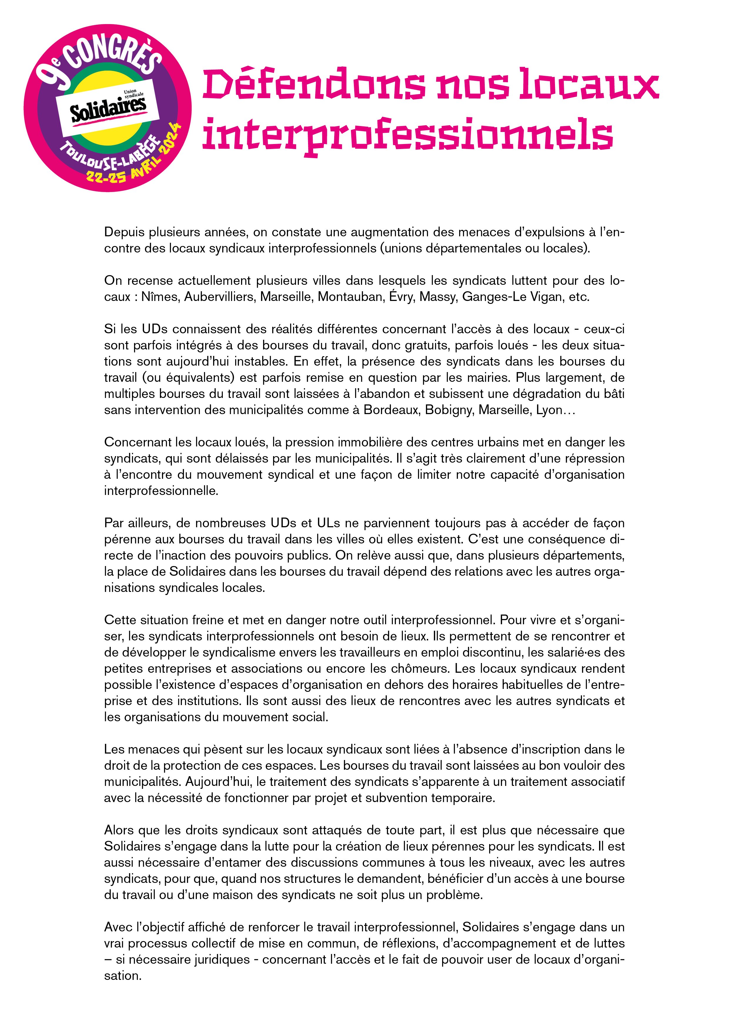 Avec l’objectif affiché de renforcer le travail interprofessionnel, Solidaires s’engage dans un vrai processus collectif de mise en commun, de réflexions, d’accompagnement et de luttes – si nécessaire juridiques - concernant l’accès et le fait de pouvoir user de locaux d’organisation.
