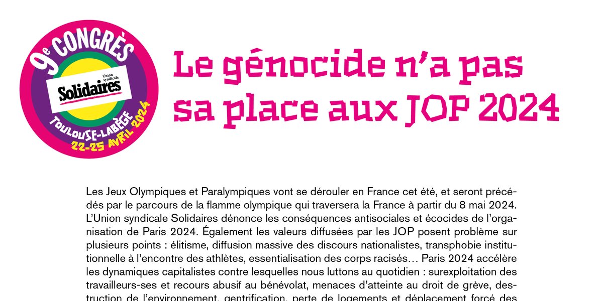 L’Union syndicale Solidaires dénonce les conséquences antisociales et écocides de l’organisation de Paris 2024. Également les valeurs diffusées par les JOP posent problème sur plusieurs points : élitisme, diffusion massive des discours nationalistes, transphobie institutionnelle à l’encontre des athlètes, essentialisation des corps racisés… Paris 2024 accélère les dynamiques capitalistes contre lesquelles nous luttons au quotidien : surexploitation des travailleurs-ses et recours abusif au bénévolat, menaces d’atteinte au droit de grève, destruction de l’environnement, gentrification, perte de logements et déplacement forcé des personnes qui vivent à la rue, mais aussi déploiement inédit de dispositifs sécuritaires et de technosurveillance. Pour ces raisons, Solidaires s’oppose à la tenue de tels JOP, maintenant et pour l’avenir.