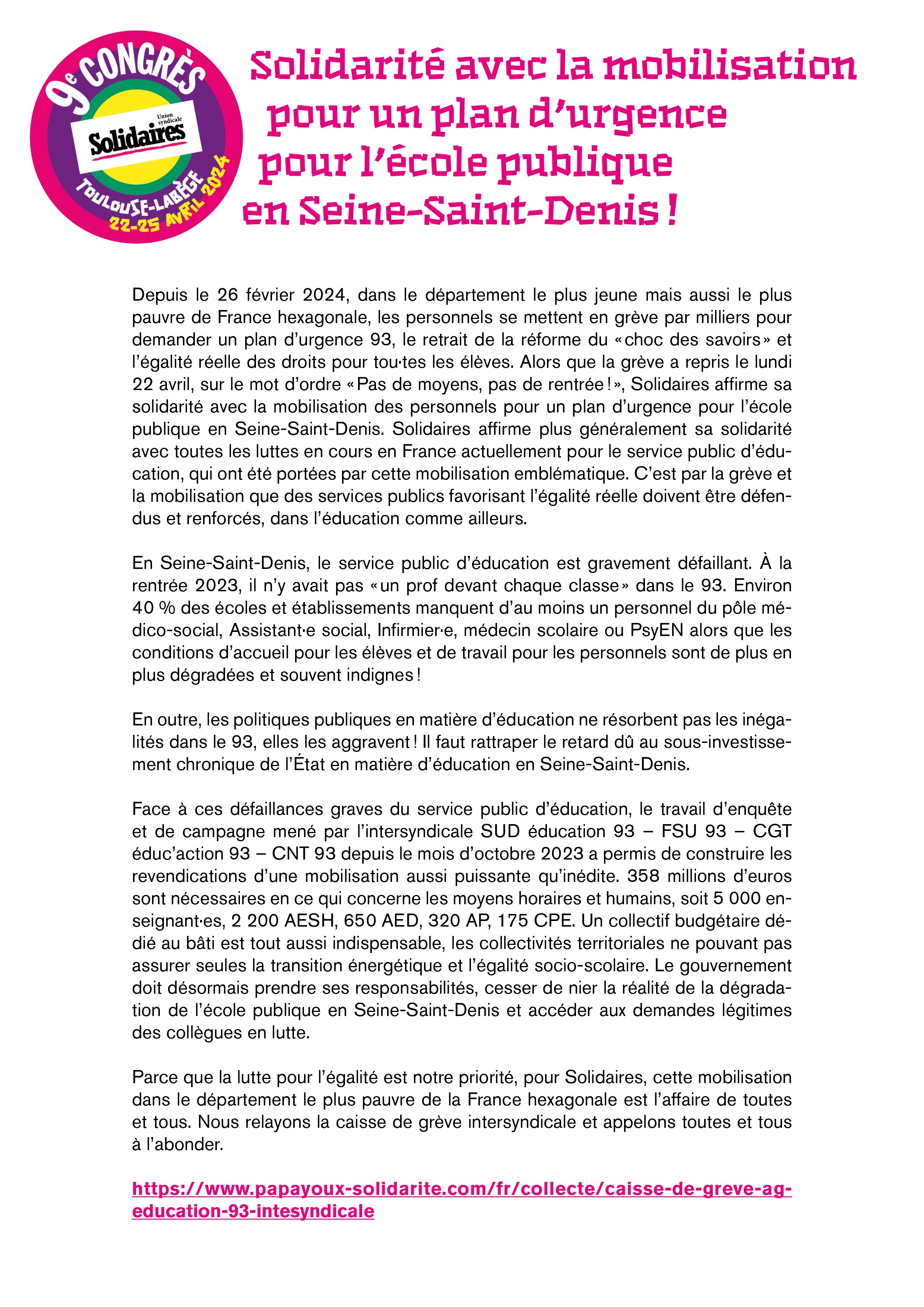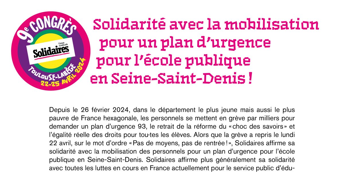 Depuis le 26 février 2024, dans le département le plus jeune mais aussi le plus pauvre de France hexagonale, les personnels se mettent en grève par milliers pour demander un plan d’urgence 93, le retrait de la réforme du « choc des savoirs » et l’égalité réelle des droits pour tou·tes les élèves. Alors que la grève a repris le lundi 22 avril, sur le mot d’ordre « Pas de moyens, pas de rentrée ! », Solidaires affirme sa solidarité avec la mobilisation des personnels pour un plan d’urgence pour l’école publique en Seine-Saint-Denis. Solidaires affirme plus généralement sa solidarité avec toutes les luttes en cours en France actuellement pour le service public d’éducation, qui ont été portées par cette mobilisation emblématique. C’est par la grève et la mobilisation que des services publics favorisant l’égalité réelle doivent être défendus et renforcés, dans l’éducation comme ailleurs.
