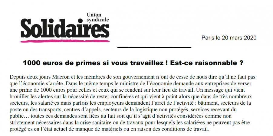 Depuis deux jours Macron et les membres de son gouvernement n’ont de cesse de nous dire qu’il ne faut pas que l’économie s’arrête. Dans le même temps le ministre de l’économie demande aux entreprises de verser une prime de 1000 euros pour celles et ceux qui se rendent sur leur lieu de travail. Un message qui vient brouiller les alertes sur la nécessité de rester confiné·es et qui vient à point alors que dans de très nombreux secteurs, les salarié·es mais parfois les employeurs demandent l’arrêt de l’activité : bâtiment, secteurs de la poste ou des transports, centres d’appels, secteurs de la logistique non protégés, services recevant du public… toutes ces demandes sont liées au fait soit qu’il s’agit d’activités considérées comme non strictement nécessaires dans la crise sanitaire ou de travaux pour lesquels les salarié·es ne peuvent pas être protégé·es en l’état actuel de manque de matériels ou en raison des conditions de travail.