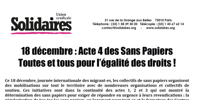 Le 18 décembre, soyons nombreuses et nombreux aux côtés des collectifs de Sans Papiers pour l’acte 4 de la marche des solidarités pour exiger l’égalité des droits pour toutes et tous !