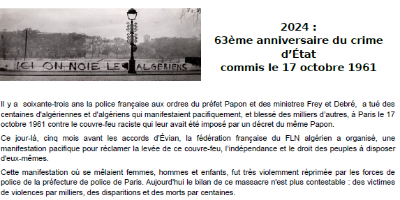Il y a soixante-trois ans la police française aux ordres du préfet Papon et des ministres Frey et Debré, a tué des centaines d'algériennes et d'algériens qui manifestaient pacifiquement, et blessé des milliers d’autres, à Paris le 17 octobre 1961 contre le couvre-feu raciste qui leur avait été imposé par un décret du même Papon.