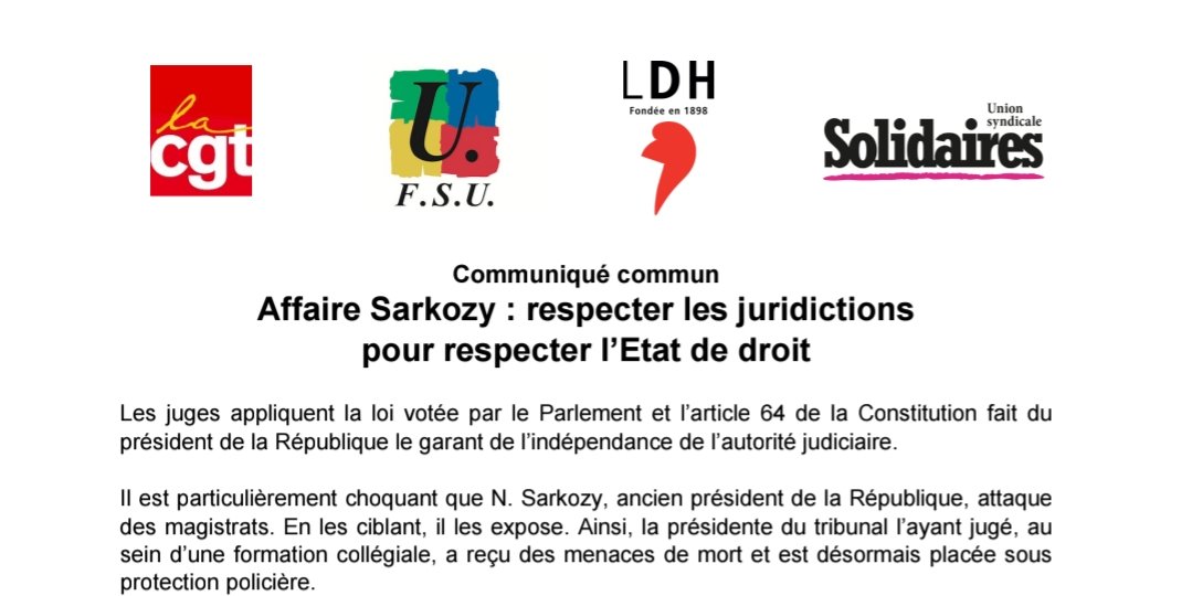 Nos organisations considèrent que dans le contexte actuel de fragilisation de la démocratie et de la cohésion sociale, il est de la responsabilité de chacune et de chacun de faire preuve de rigueur sur le respect de l’autorité judiciaire et de l’intégrité professionnelle des magistrats.