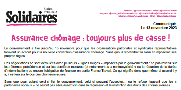 L’Union syndicale Solidaires dénonce ces reculs de droits inacceptables. Il faut au contraire arrêter la culpabilisation et les économies de bouts de chandelle sur le dos des chômeur-euses, instaurer un véritable statut des salarié-es et de toutes les catégories des travailleurs-euses.