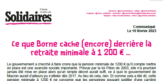 Tout comme la loi Kasbarian ou la réforme chômage, il n’y a qu’une seule destination possible pour cette réforme des retraites : la poubelle de l’histoire. A l’opposé, l’Union syndicale Solidaires revendique une retraite avec âge de départ à taux plein soit 75 % du meilleur salaire dès 60 ans (et 55 ans pour les métiers pénibles), pas une retraite en dessous du SMIC revendiqué à 1 700 € nets, un partage du temps de travail à 32h hebdomadaires sans perte de salaire.