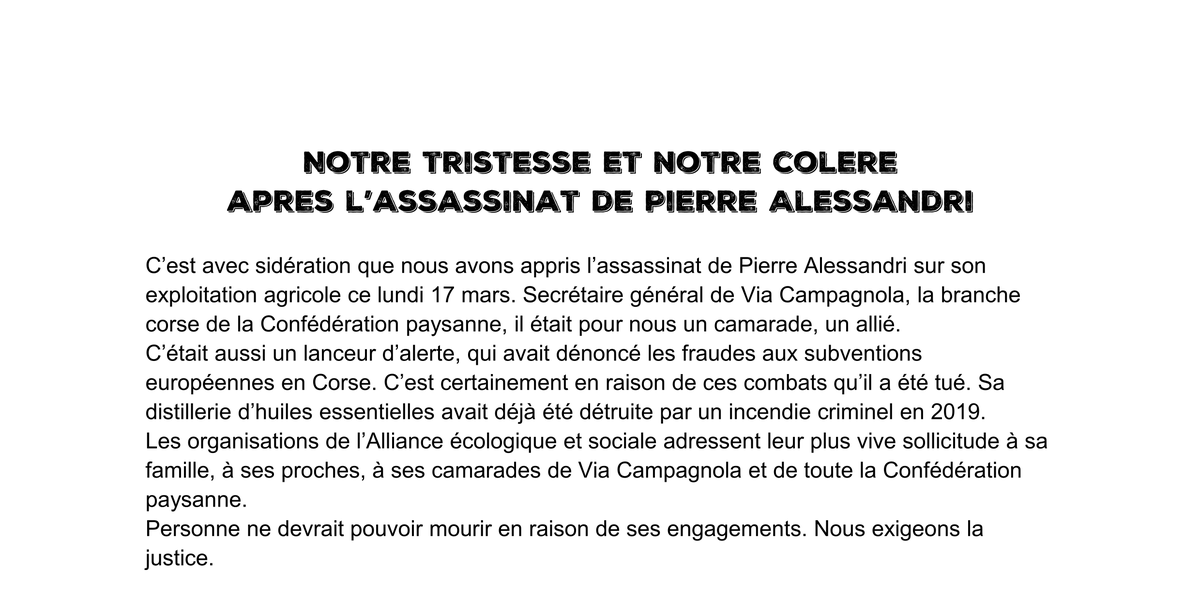 C’est avec sidération que nous avons appris l’assassinat de Pierre Alessandri sur son exploitation agricole ce lundi 17 mars. Secrétaire général de Via Campagnola, la branche corse de la Confédération paysanne, il était pour nous un camarade, un allié.