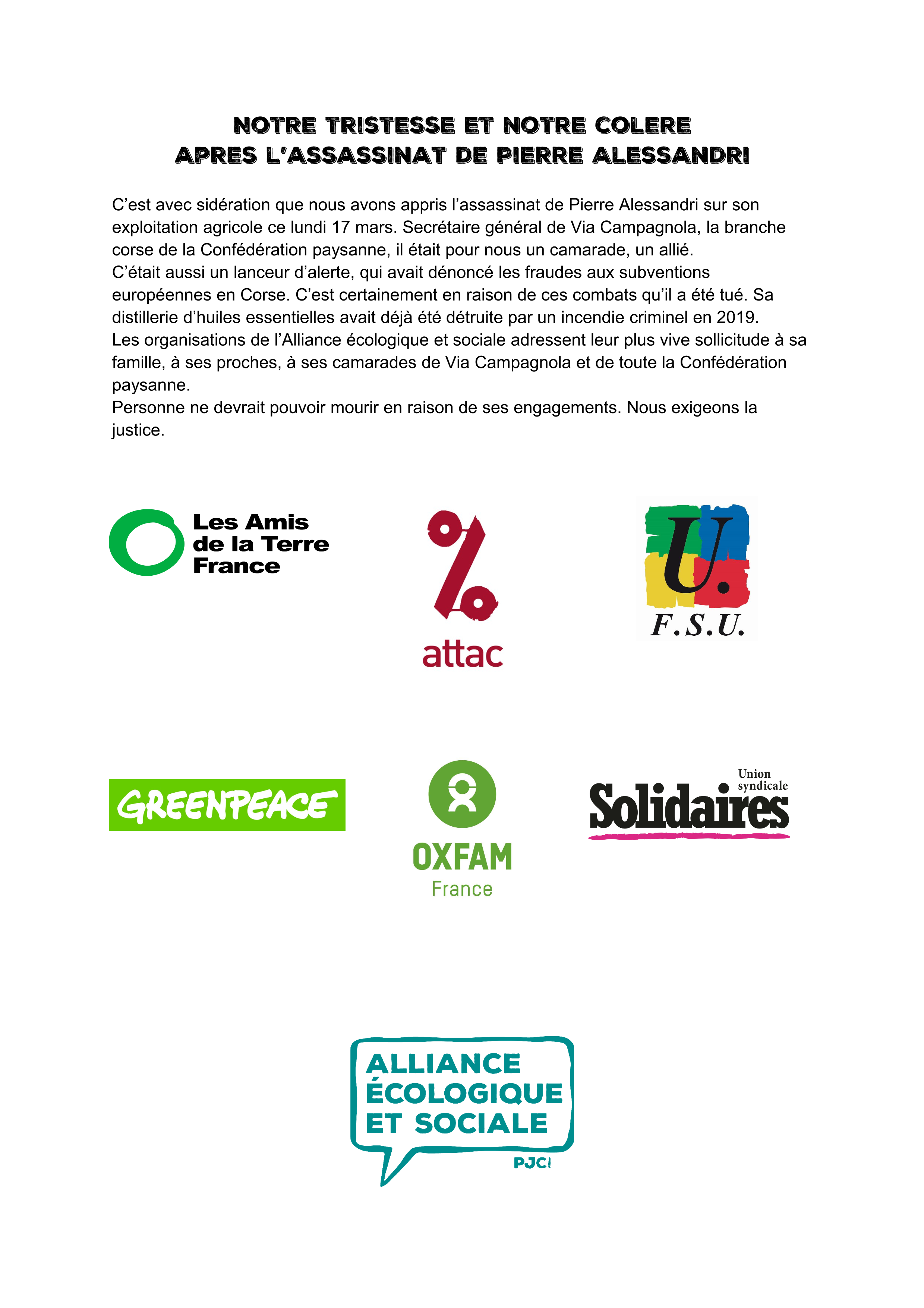 Les organisations de l’Alliance écologique et sociale adressent leur plus vive sollicitude à sa famille, à ses proches, à ses camarades de Via Campagnola et de toute la Confédération paysanne.