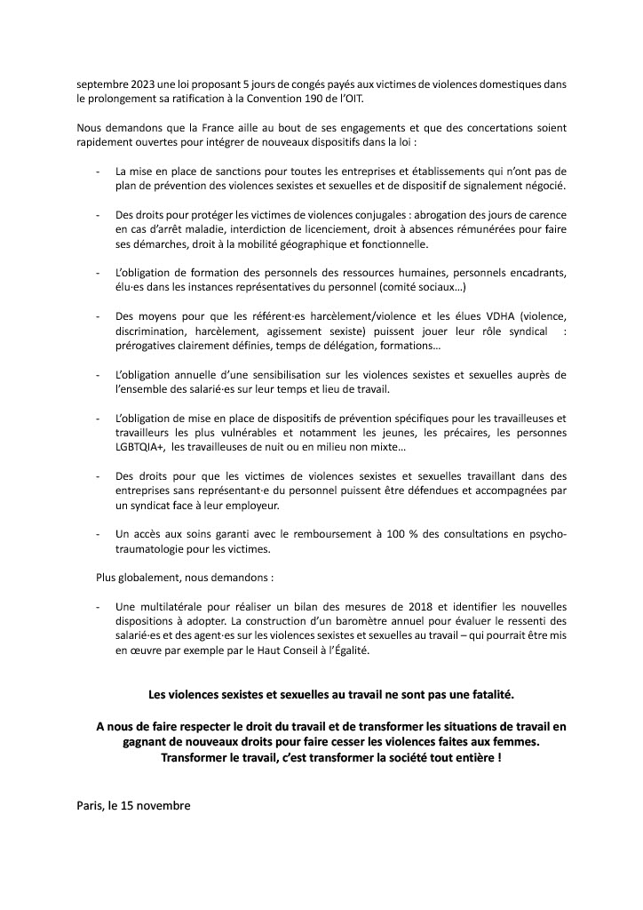 - Des droits pour que les victimes de violences sexistes et sexuelles travaillant dans des entreprises sans représentant·e du personnel puissent être défendues et accompagnées par un syndicat face à leur employeur.