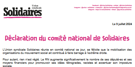 L’Union syndicale Solidaires réunie en comité national ce jour, se félicite que la mobilisation des organisations du mouvement social ait contribué à faire barrage à l’extrême droite.