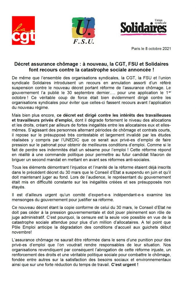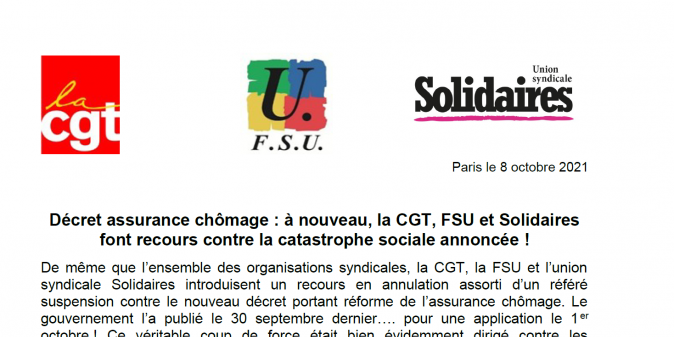 De même que l’ensemble des organisations syndicales, la CGT, la FSU et l’union syndicale Solidaires introduisent un recours en annulation assorti d’un référé suspension contre le nouveau décret portant réforme de l’assurance chômage. Le gouvernement l’a publié le 30 septembre dernier…. pour une application le 1er octobre ! Ce véritable coup de force était bien évidemment dirigé contre les organisations syndicales pour éviter que celles-ci fassent recours avant l’application du nouveau régime.