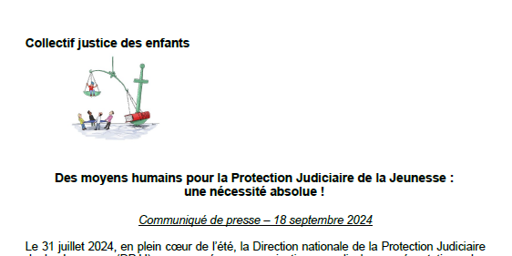 Communiqué de soutien du collectif justice des enfants à la mobilisation du secteur de la protection judiciaire de la jeunesse le 19 septembre.