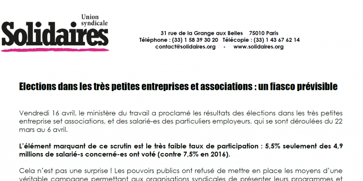 Vendredi 16 avril, le ministère du travail a proclamé les résultats des élections dans les très petites entreprises et associations, et des salarié-es des particuliers employeurs, qui se sont déroulées du 22mars au 6 avril.
