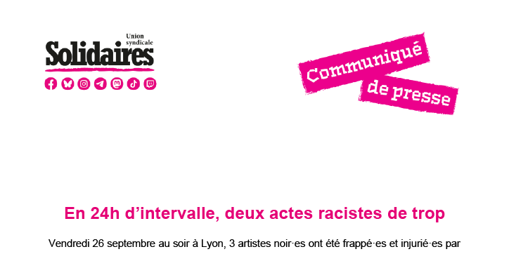 L’Union syndicale Solidaires apporte tout son soutien aux victimes de ces actes odieux que nous dénonçons très fermement. L’Union syndicale Solidaires dénonce également les discours racistes tenus régulièrement sur certaines chaînes de média qui laissent faire et incitent par ce fait à la haine raciale.