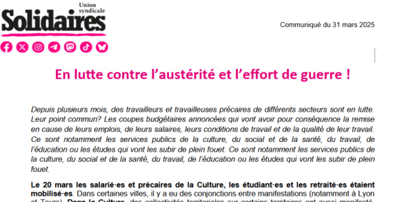 Le 20 mars les salarié·es et précaires de la Culture, les étudiant·es et les retraité·es étaient mobilisé·es. Dans certaines villes, il y a eu des conjonctions entre manifestations (notamment à Lyon et Tours). Dans la Culture, des collectivités territoriales sur certains territoires ont aussi manifesté. Cette mobilisation au long cours dit le refus de voir la culture, le lien social qui en découle, sacrifié sur l’autel des politiques de Macron et de son “effort de guerre”.