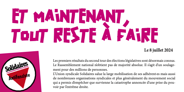 L’Union syndicale Solidaires salue la large mobilisation de ses adhérent·es mais aussi de nombreuses organisations syndicales et plus généralement du mouvement social qui a permis d’empêcher que survienne la catastrophe annoncée d’une prise du pouvoir par l’extrême droite.
