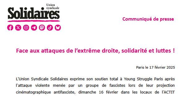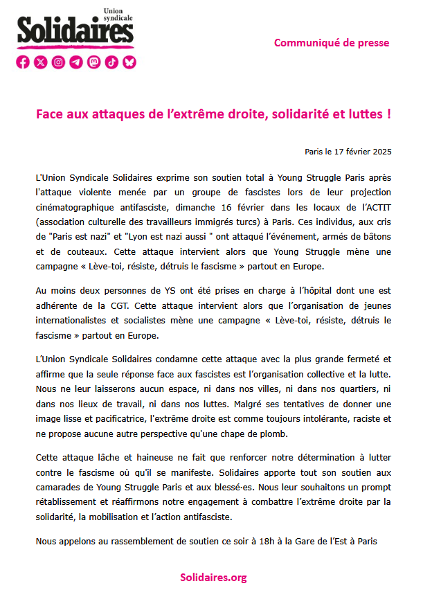 Cette attaque lâche et haineuse ne fait que renforcer notre détermination à lutter contre le fascisme où qu'il se manifeste. Solidaires apporte tout son soutien aux camarades de Young Struggle Paris et aux blessé·es. Nous leur souhaitons un prompt rétablissement et réaffirmons notre engagement à combattre l’extrême droite par la solidarité, la mobilisation et l’action antifasciste.