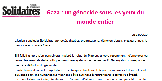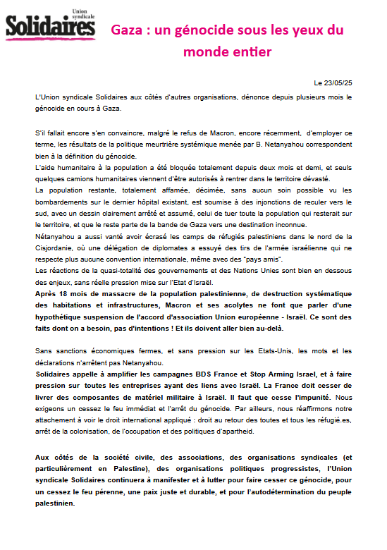L'Union syndicale Solidaires aux côtés d’autres organisations, dénonce depuis plusieurs mois le génocide en cours à Gaza.