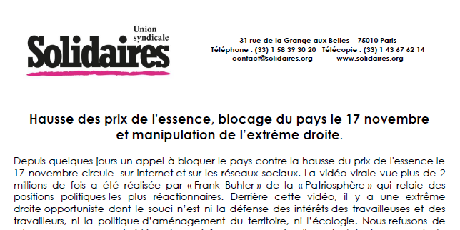 Depuis quelques jours un appel à bloquer le pays contre la hausse du prix de l'essence le 17 novembre circule sur internet et sur les réseaux sociaux. La vidéo virale vue plus de 2 millions de fois a été réalisée par « Frank Buhler » de la « Patriosphère » qui relaie des positions politiques les plus réactionnaires. Derrière cette vidéo, il y a une extrême droite opportuniste dont le souci n’est ni la défense des intérêts des travailleuses et des travailleurs, ni la politique d’aménagement du territoire, ni l’écologie. Nous refusons de relayer ses messages et vidéos et nous informons ceux et celles qui relaient ces appels de bonne foi de leur origine et de la manipulation qu’ils constituent.