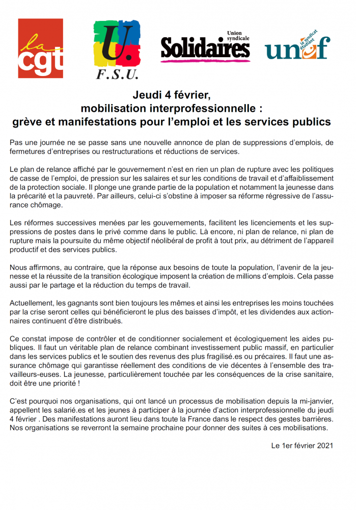 C’est pourquoi nos organisations, qui ont lancé un processus de mobilisation depuis la mi-janvier, appellent les salarié.es et les jeunes à participer à la journée d’action interprofessionnelle du jeudi 4 février . Des manifestations auront lieu dans toute la France dans le respect des gestes barrières. Nos organisations se reverront la semaine prochaine pour donner des suites à ces mobilisations.