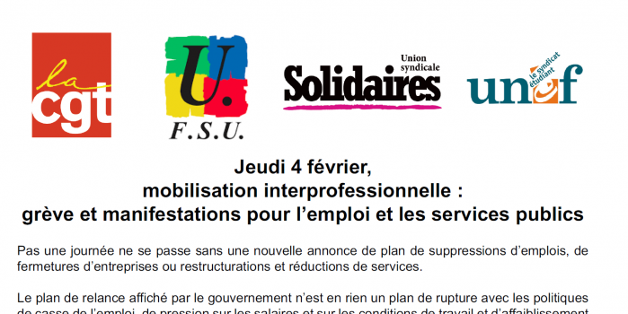 Jeudi 4 février, mobilisation interprofessionnelle : grève et manifestations pour l’emploi et les services publics
