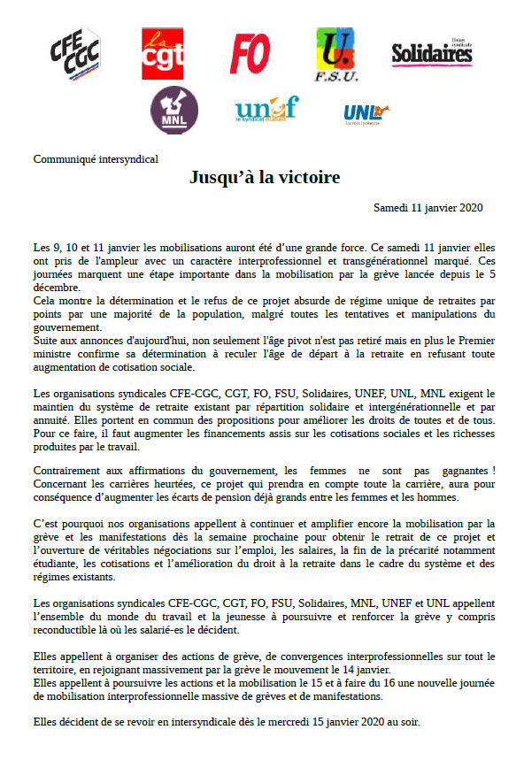 Elles décident de se revoir en intersyndicale dès le mercredi 15 janvier 2020 au soir.