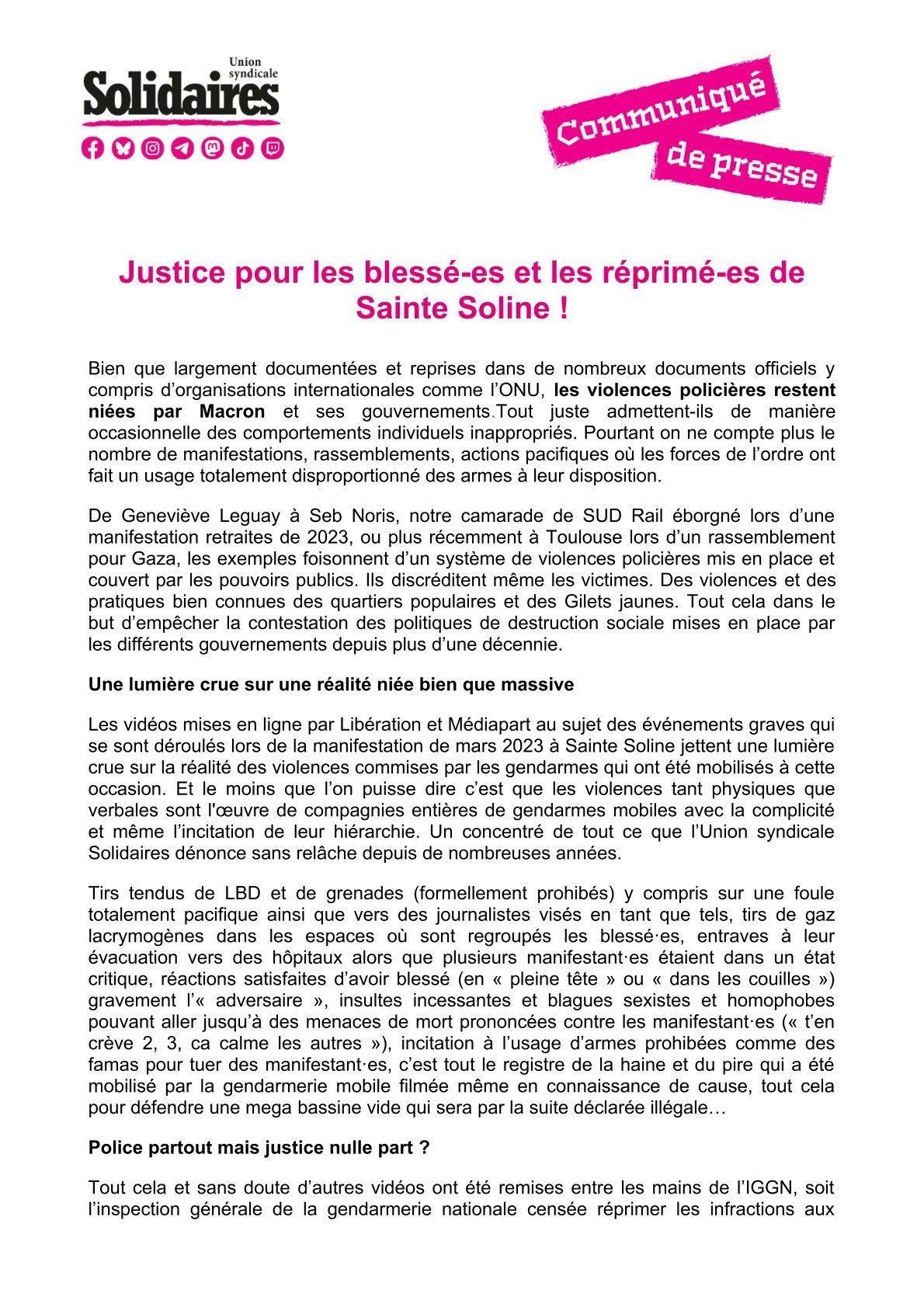 L’Union syndicale Solidaires exige en outre que soit mis fin aux poursuites engagées contre les militant·es injustement mis en cause dans les affrontements de Sainte Soline alors que la responsabilité des violences incombe de manière indiscutable aux forces de l’ordre.