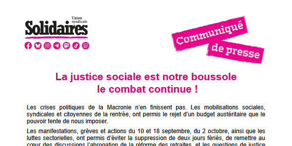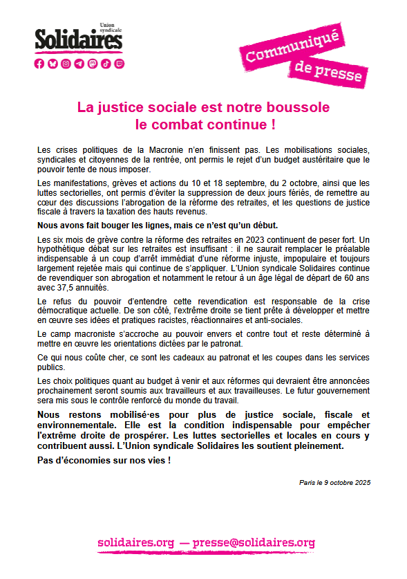 Nous restons mobilisé·es pour plus de justice sociale, fiscale et environnementale. Elle est la condition indispensable pour empêcher l'extrême droite de prospérer. Les luttes sectorielles et locales en cours y contribuent aussi. L’Union syndicale Solidaires les soutient pleinement.