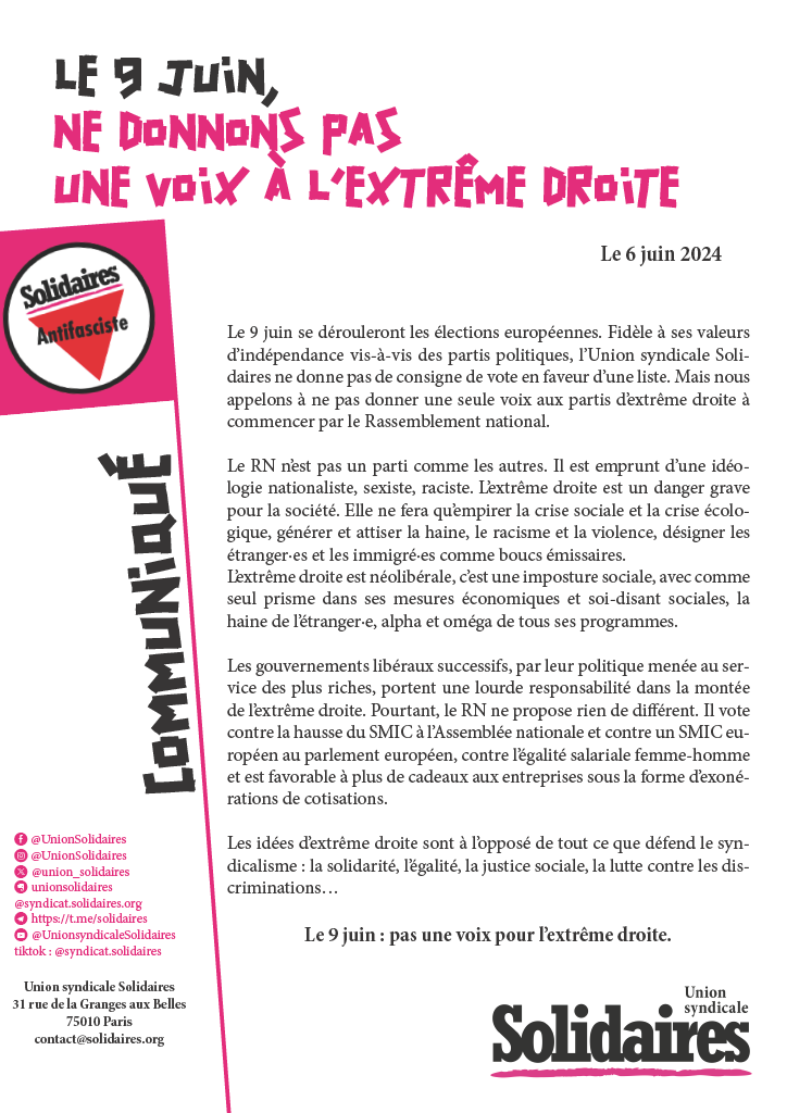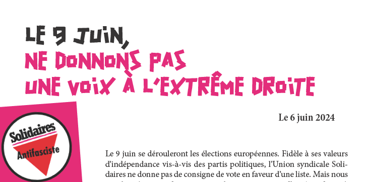 Le 9 juin se dérouleront les élections européennes. Fidèle à ses valeurs d’indépendance vis-à-vis des partis politiques, l’Union syndicale Solidaires ne donne pas de consigne de vote en faveur d’une liste. Mais nous appelons à ne pas donner une seule voix aux partis d’extrême droite à commencer par le Rassemblement national.