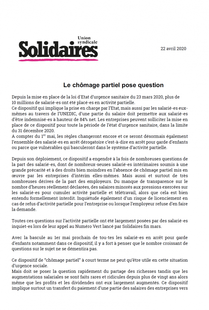 Mais doit se poser la question rapidement du partage des richesses tandis que les augmentations salariales se sont faits rares et ridicules depuis plus de vingt ans alors même que les profits et les dividendes ont eux largement augmentés. Ce dispositif 22 avril 2020 implique surtout un transfert du paiement d’une partie des salaires des entreprises vers l’Etat et les salarié-es eux-mêmes. Or par ailleurs, les sources de financement de l’Etat ont été largement taries notamment par la suppression de l’ISF et une fiscalité favorable aux plus riches, tandis que la fraude fiscale est évaluée à 100 milliards d’euros par an en France et que les moyens d’y faire face ne sont pas satisfaisants.