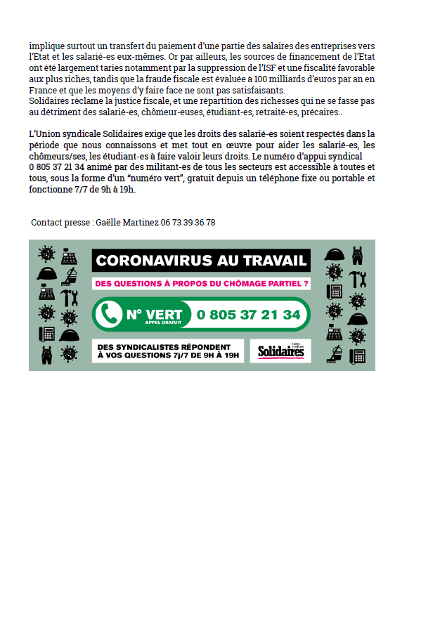 L’Union syndicale Solidaires exige que les droits des salarié-es soient respectés dans la période que nous connaissons et met tout en oeuvre pour aider les salarié-es, les chômeurs/ses, les étudiant-es à faire valoir leurs droits. Le numéro d’appui syndical 0 805 37 21 34 animé par des militant-es de tous les secteurs est accessible à toutes et tous, sous la forme d’un “numéro vert”, gratuit depuis un téléphone fixe ou portable et fonctionne 7/7 de 9h à 19h.