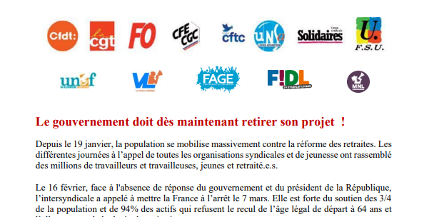 Le 16 février, face à l'absence de réponse du gouvernement et du président de la République, l’intersyndicale a appelé à mettre la France à l’arrêt le 7 mars. Elle est forte du soutien des 3/4 de la population et de 94% des actifs qui refusent le recul de l’âge légal de départ à 64 ans et l’allongement de la durée de cotisations.