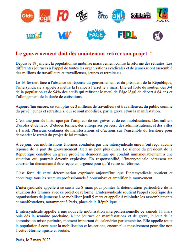 L’intersyndicale appelle à une nouvelle mobilisation interprofessionnelle ce samedi 11 mars puis dès la semaine prochaine, à une journée de manifestations et de grève, le jour de la commission mixte paritaire, moment important du calendrier parlementaire. Elle appelle toute la population à continuer la mobilisation et les actions, encore plus massivement pour dire non à cette réforme injuste et brutale.