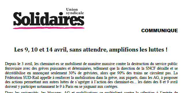 Depuis le 3 avril, les cheminot-es se mobilisent de manière massive contre la destruction du service public ferroviaire avec des grèves puissantes et déterminées, tellement que la direction de la SNCF déraille et se décrédibilise en annonçant seulement 30% de grévistes, alors que 90% des trains ne circulent pas. La Fédération SUD-Rail appelle à renforcer la mobilisation dans la grève, aux piquets, dans les AG, à proposer des actions permettant aux autres luttes de s’agréger à l’action des cheminot-es... les dates des 8 et 9 avril doivent y participer notamment le 9 à Paris en se joignant aux cortèges.